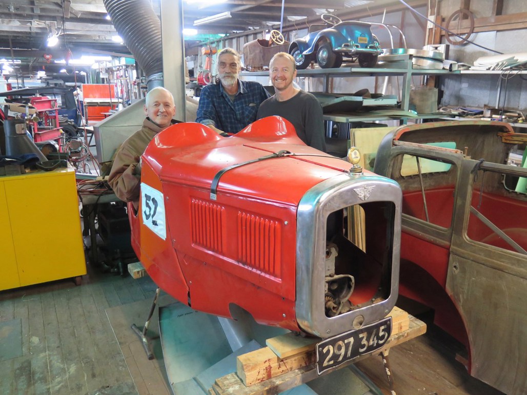 Richard McWhannell in the Dieppe Sports that donated its rolling chassis to the replica with fellow builders Joss Campbell (left) and Ian Williams, outside the workshop where the body was built.