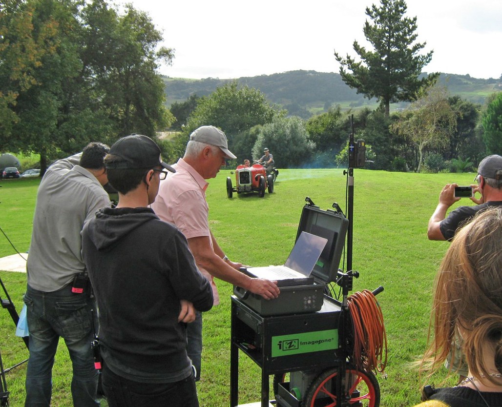Roger Donaldson (in pink shirt) on set as the replica hoons on the grass.
