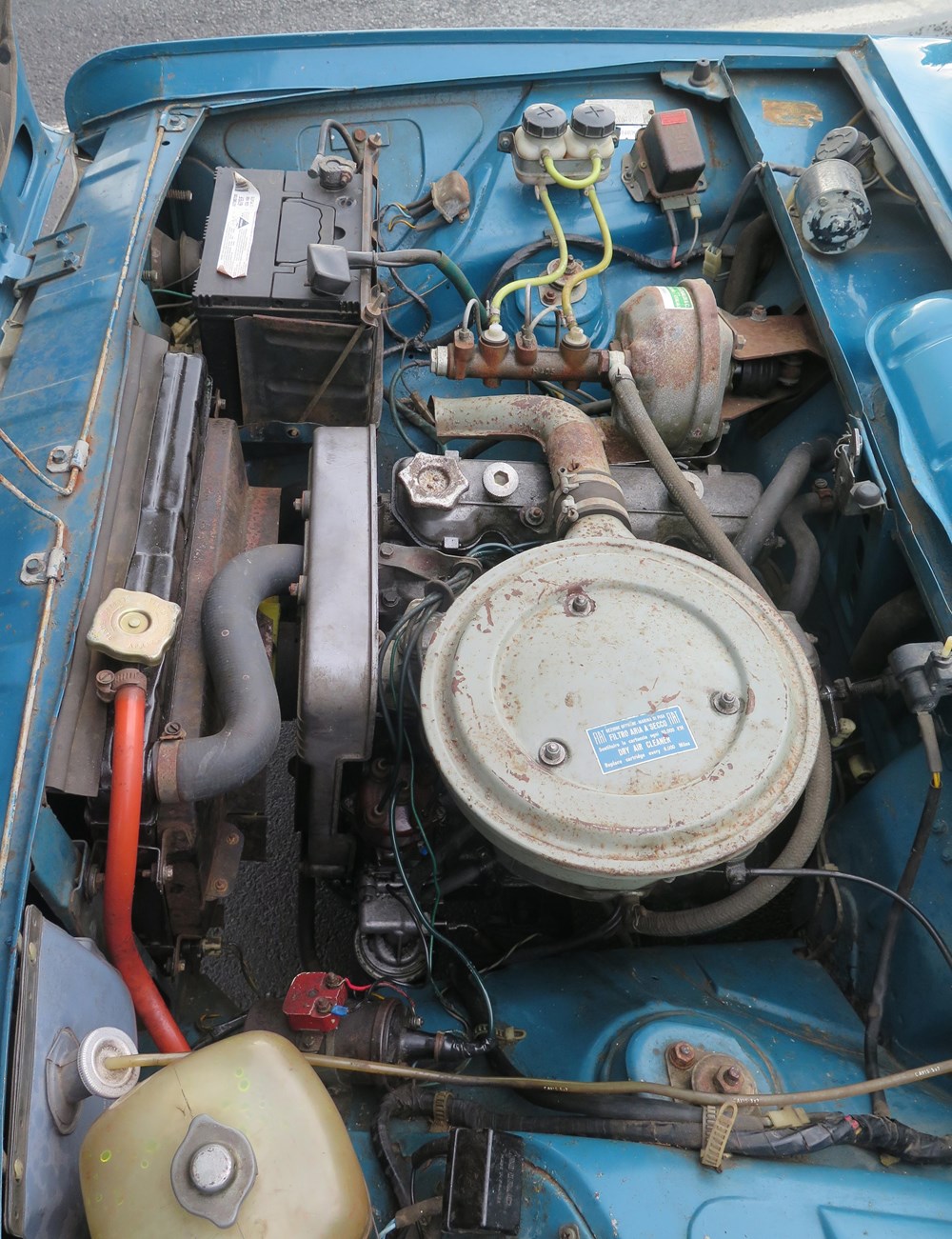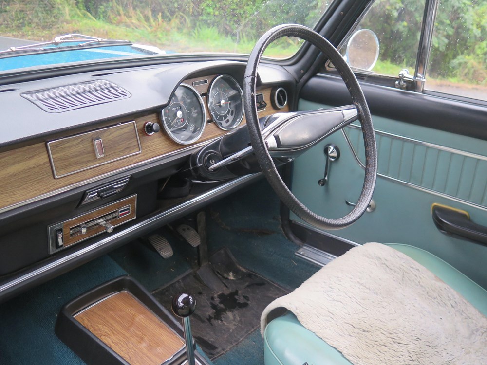The car is original, from the paint in, including the slightly wrinkled “wood effect” console trim and the standard tool kit.