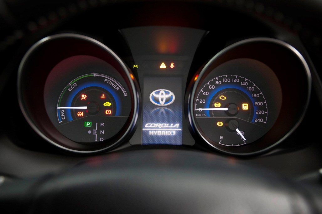 On the outside, the Corolla hybrid has LED headlights and LED daytime running lights, plus hybrid badges on the front fenders and hybrid emblems at the front and rear.