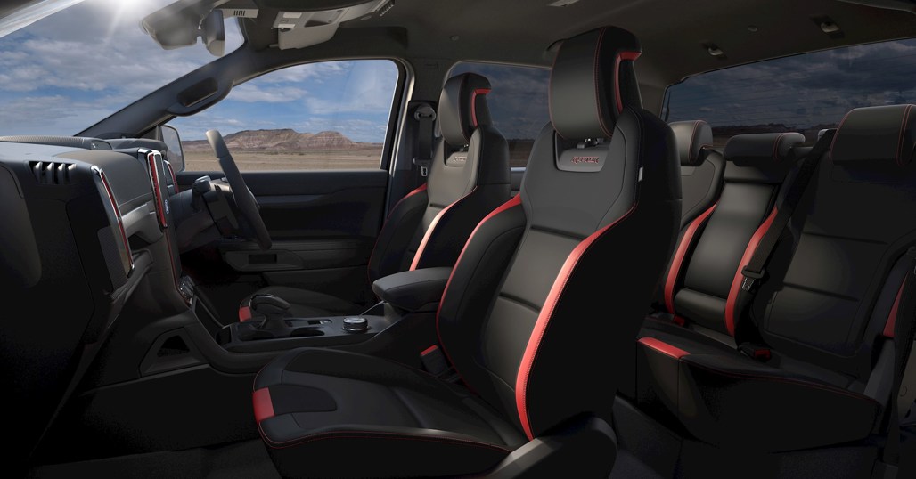 It gets the same high-resolution digital instrument cluster and centre console screens as general-issue Ranger, but with more functionality, plus there’s a sports-style seat and thicker-rimmed steering wheel and paddle shifters. BTW, NZ specification absents the bead lock wheels optional across the Tasman, active park assist 2.0 and the decal pack option and colour choices are more limited.