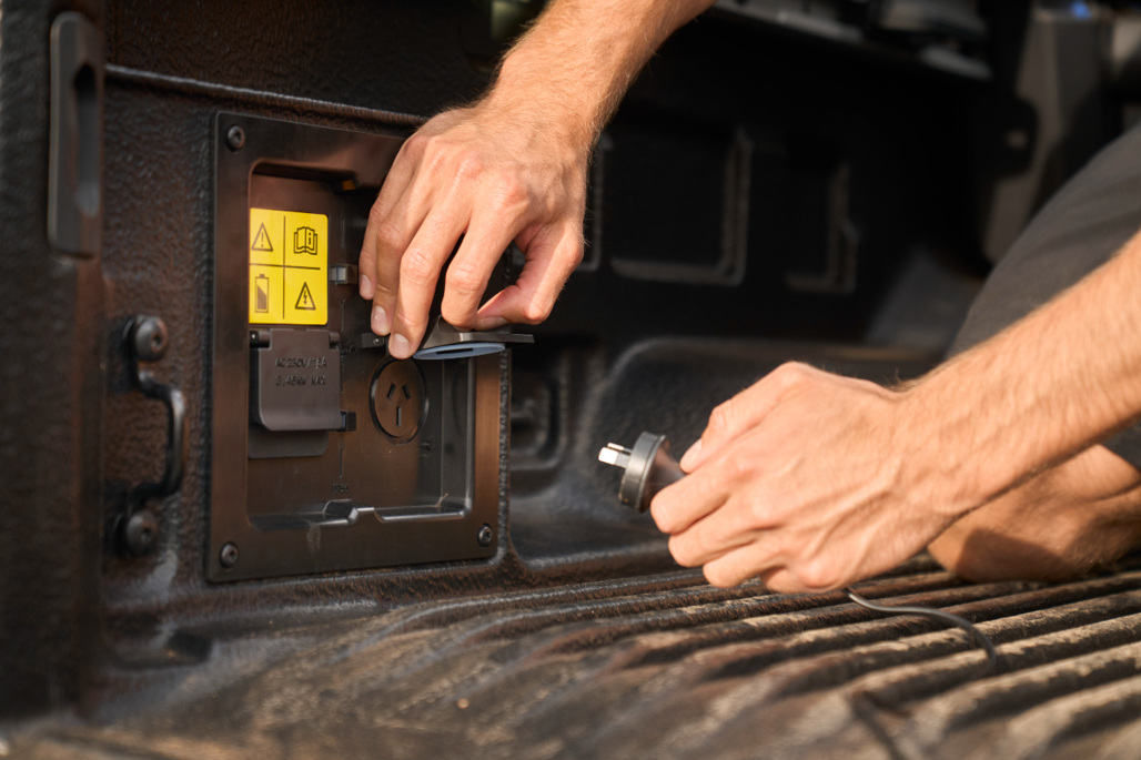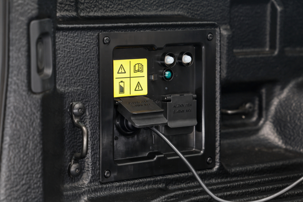 Under the power roller-cover, the tray houses twin 3.45kW outlets for PPOB; together with the 2.3kW socket in the cabin, it can power up to 6.9kW at once. It draws from the traction battery, but if that's not sufficiently charged you can run the petrol engine as a generator right down to 80km driving range.