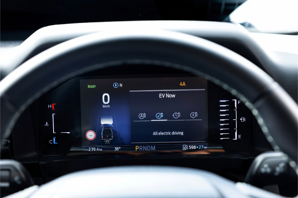 When you lock Ranger PHEV into electric mode ("EV Now") all you've got is 75kW. It's fine actually, but not quick; if you ask for full power you get a prompt on the instrument panel asking if the petrol engine can be activated. One click and you're away.