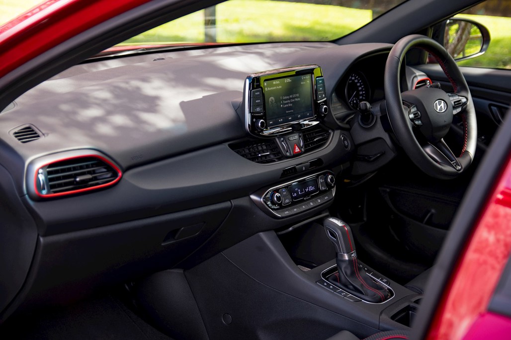 The tenacious engine's biggest supporters are those tyres and the dual-clutch transmission. Few cars under $50,000 come with a stickier tyre than the Michelin-shod Hyundai. They allow it to clamp onto the road in a way few others can, helping provide extra confidence both when tipping the N-Line into a corner and under power. The DCT meanwhile is a quick operator at speed, particularly when triggered by its paddles in manual mode.