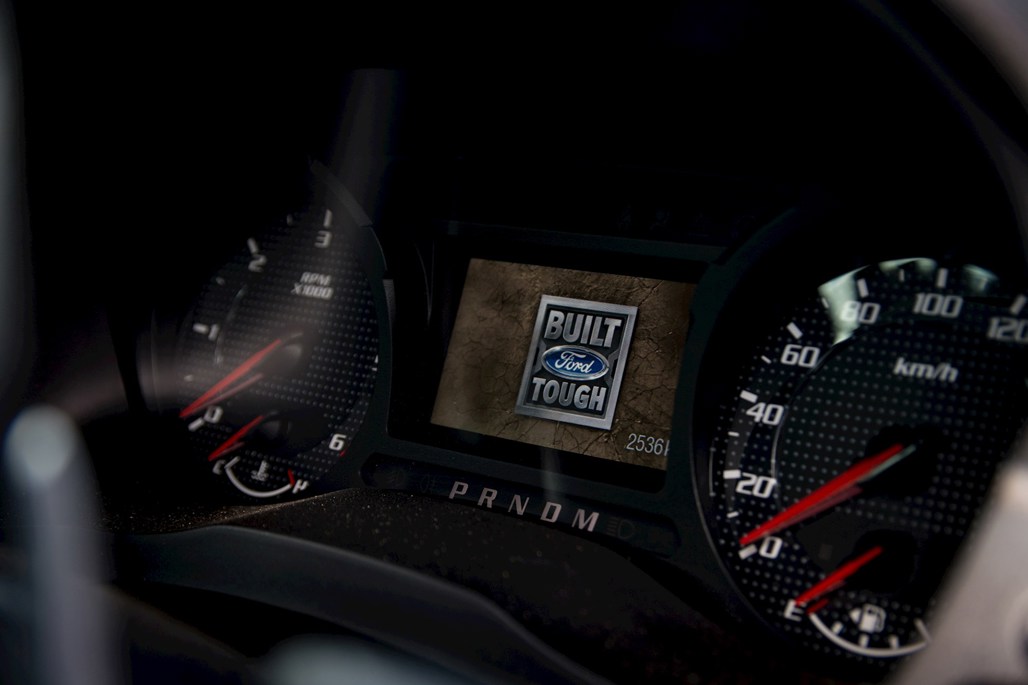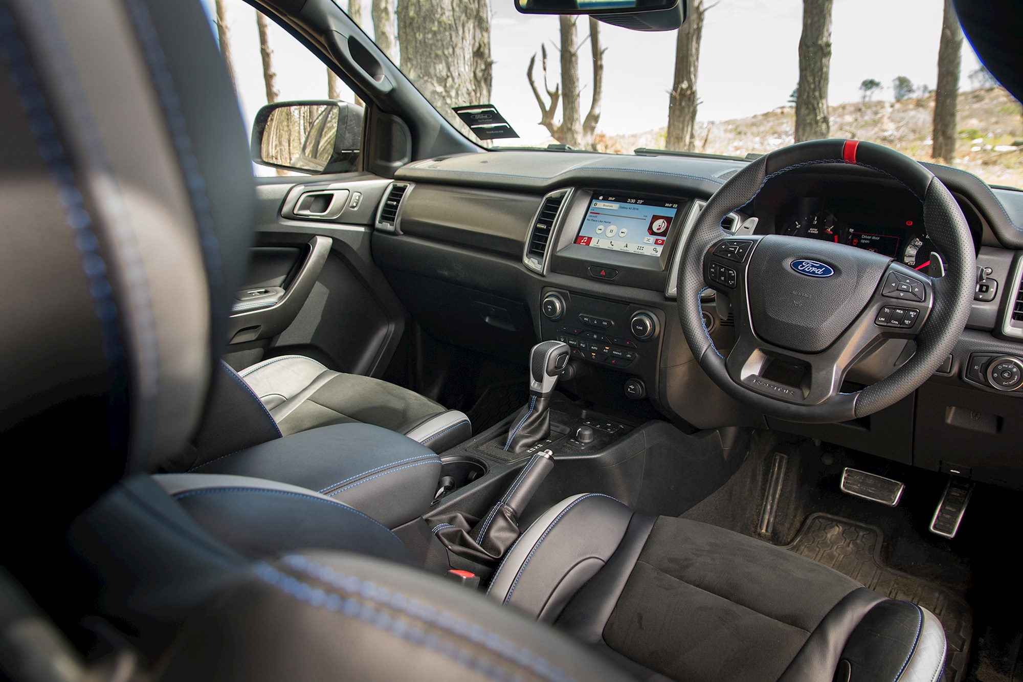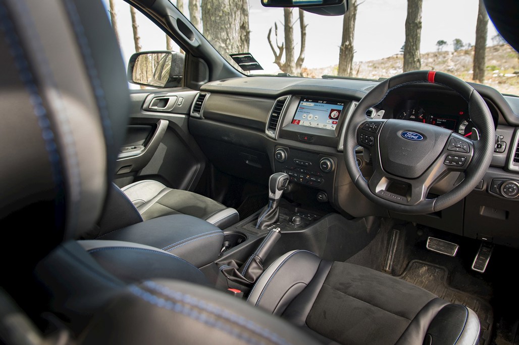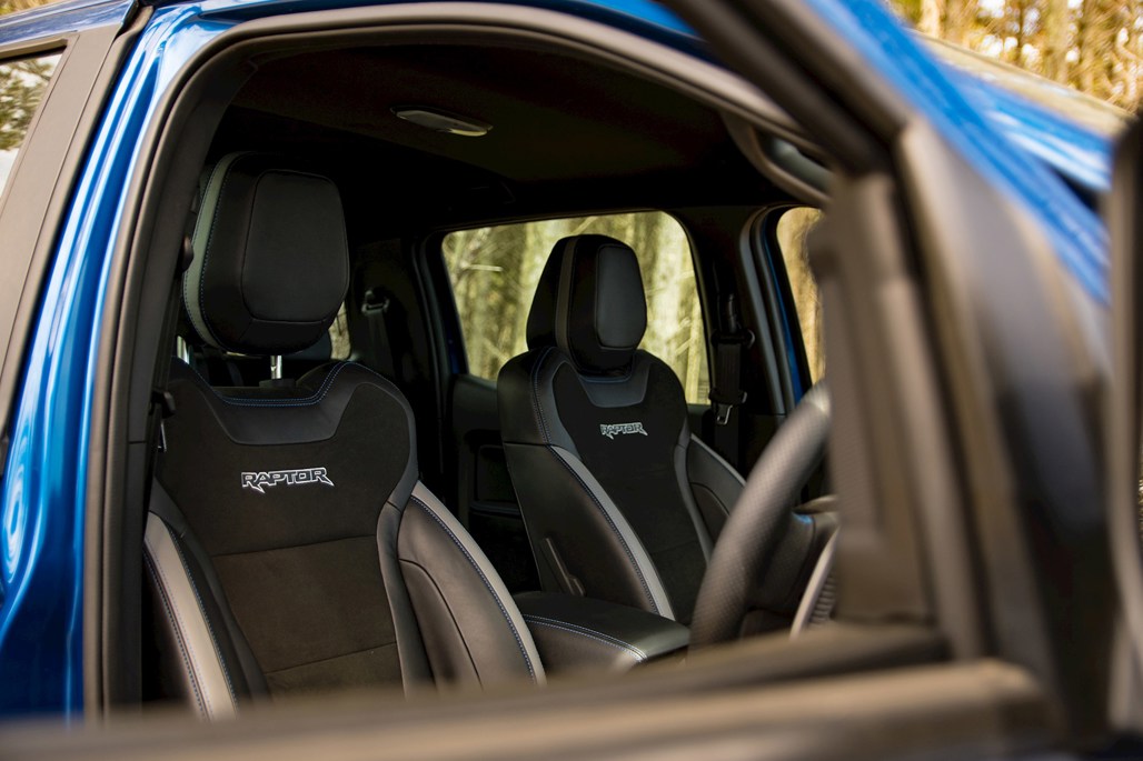 Changes in the cabin aren’t nearly as vast. Blue stitching frames the padded dashboard and more, while standard Ranger seats get chucked in favour of a comfortable pair of heated suede and leatherette buckets. Magnesium paddle shifters and a new steering wheel are also Raptor exclusives, with almost everything else formed out of cheap but durable plastics.