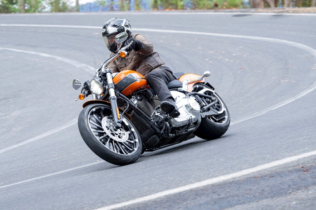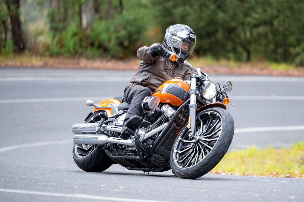 The question was asked by a parked ute driver witnessing a Breakout photo shoot on a tight 180-degree corner near Mount Beauty. That Softail frame is generally a sweet-handling bit of kit, but there are cornering dynamic prices to be paid for the Breakout’s drag racing inspired features – the extra steering rake, the low stance, and the sluggish inertia felt before getting that fat rear tyre heeled onto its side.