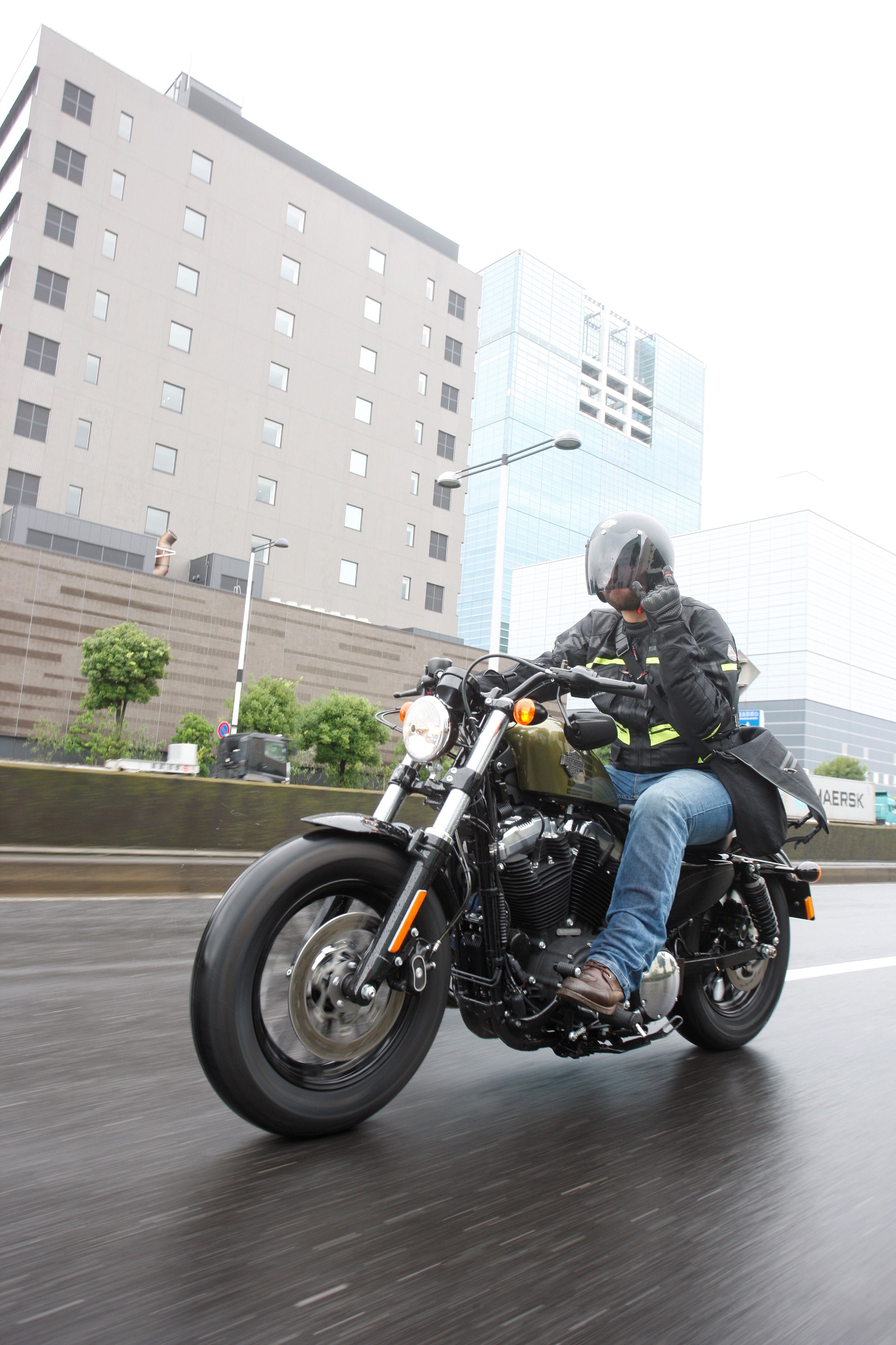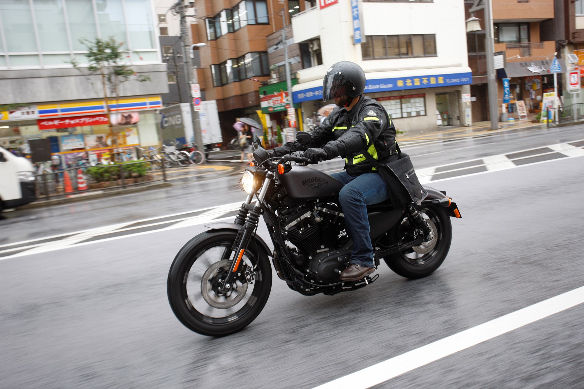 Mathieu Day riding the Harley-Davidson Forty-Eight in Tokyo.