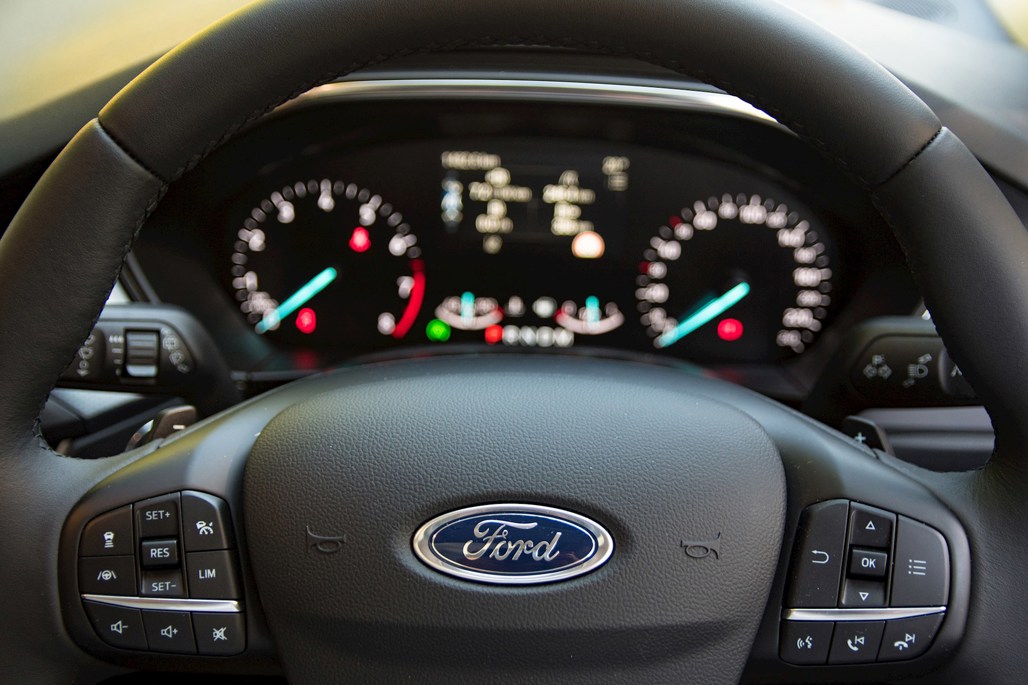 Branded scuff plates and an interior upholstery formed out of a hardier cloth material woven together with blue contrast stitching seal the Focus Active's differences.