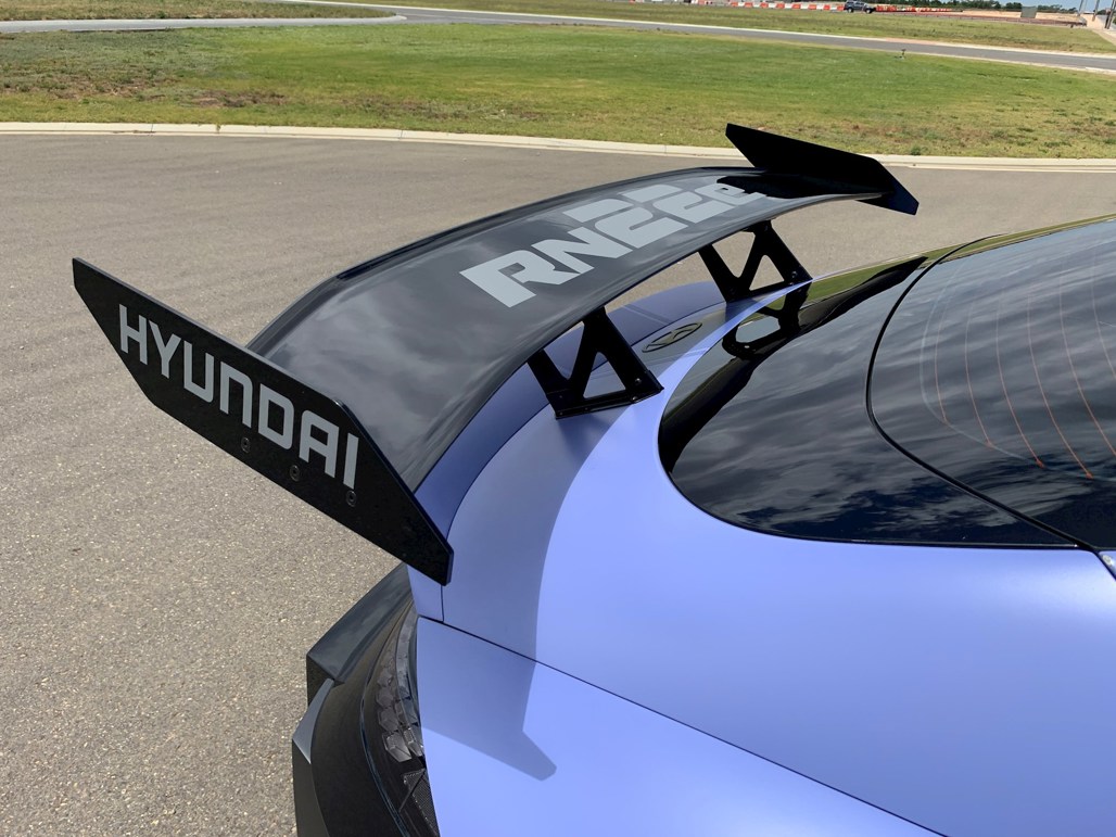 It’s an imposing 4.9m long, there’s also a roll-cage, gutted interior, around 100 people watching on, including Hyundai’s engineer sitting in the passenger seat. Oh, we’re also doing our first laps at speed of the massive 7.77km GT track at The Bend, an hour east of Adelaide. And we’re out on track among the other N fans and faithful, in road i20 Ns, i30 Ns, Kona Ns and more, as part of the 2022 two-day N Festival.