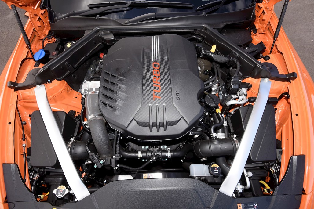 Those changes excepted, this is a standard Kia Stinger GT delivering the increasingly rare rear-wheel drive large car format and endowed with 3.3-litre V6 twin turbo urgency and tyres in mixed sizing — 225/40 R19 front tyres and 255/35 R19 at the rear. It also has powerful braking with 350mm front discs and four piston Brembo callipers and 340mm discs at the rear with two piston callipers.