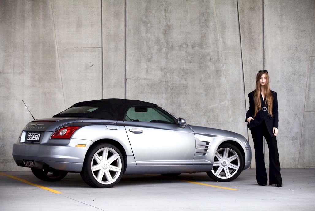 It’s a 2005 Chrysler Crossfire two-seater convertible in a cold steel blue silver. It’s automatic, has low profile tyres, and it was built by Karmann based on the SLK Mercedes made in Germany.