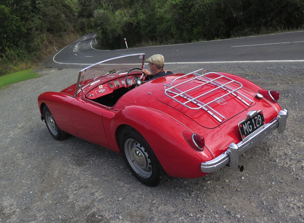 The car’s finished in the original colour combo, though the fabric roof is black, “I imagine it’d have been red.” They put the hard top on for winter, or long trips, “otherwise you sit in the sun and fry”. The couple have just returned from a trip to Greymouth in the MGA.
