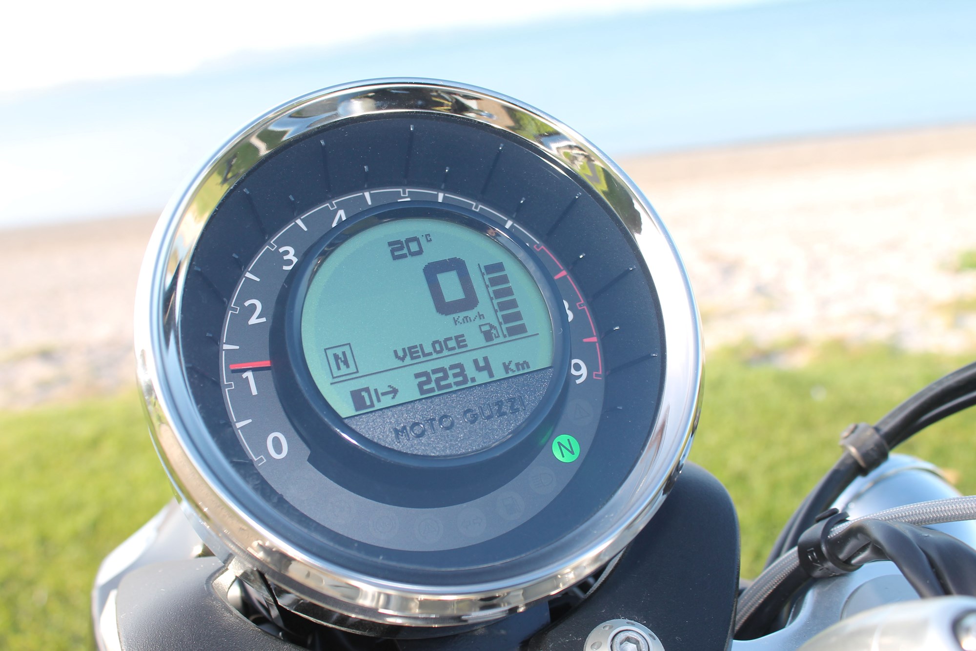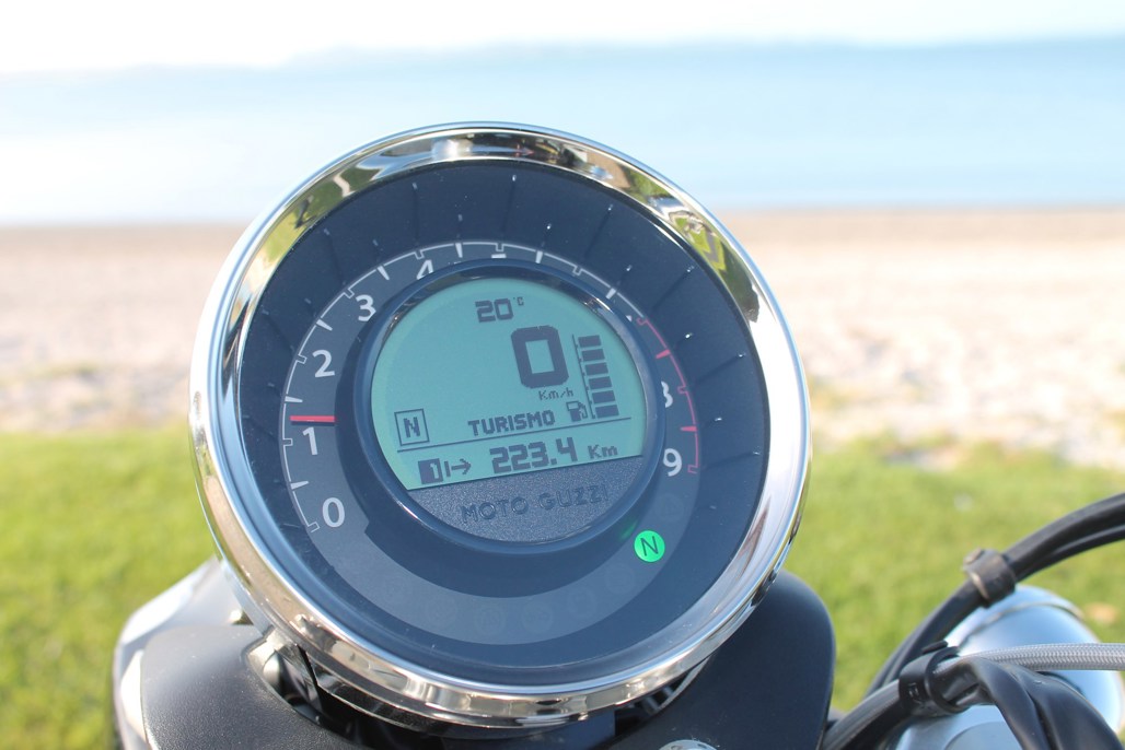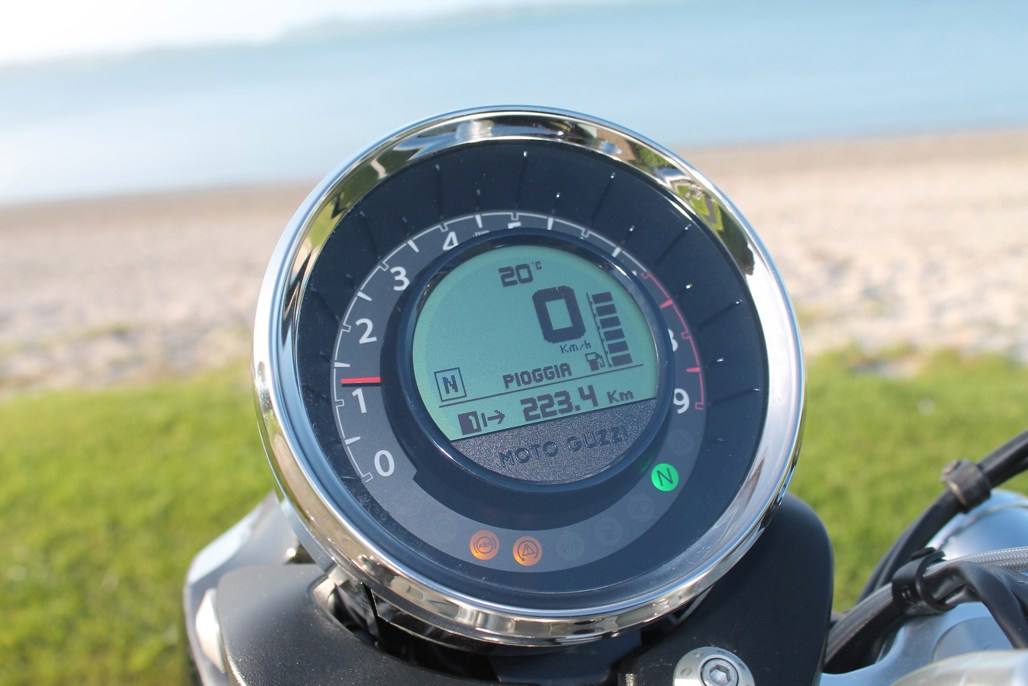 Once the bike is running, the starter button becomes the rider mode switch, allowing you to change between Turismo (Touring), Veloce (Fast), and Poiggia (Rain) modes.