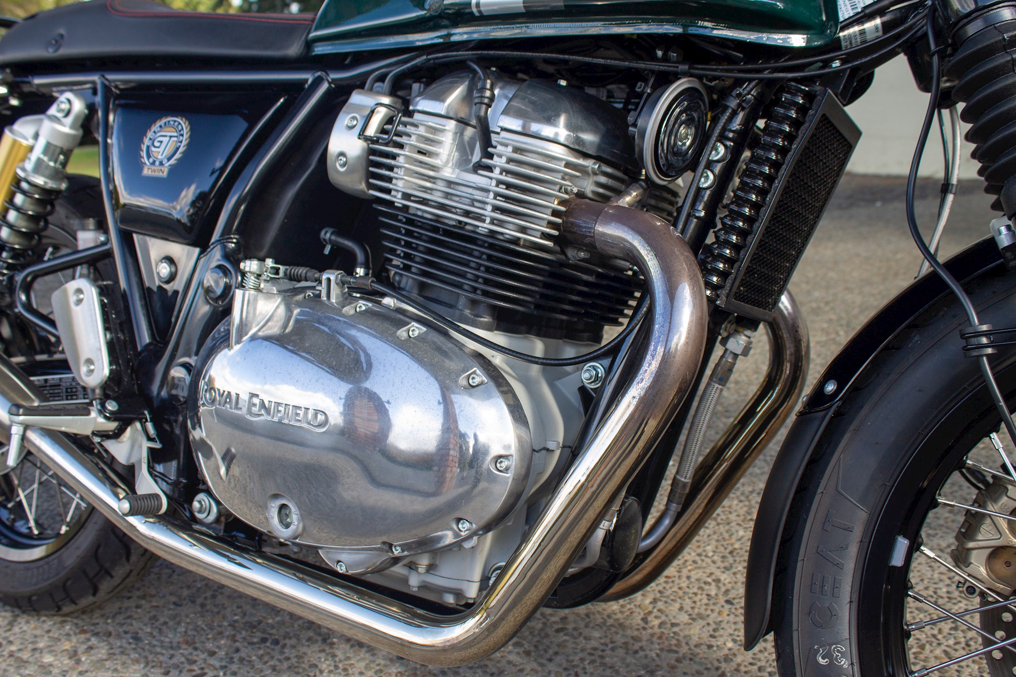 Unlike the Classic 350, the Continental GT and its Interceptor sibling don’t make use of metal for all their bodywork. The mudguards, in particular, are plastic and feature removable lips for added protection, which helps prevent the parallel twin from getting too dirty between washes.