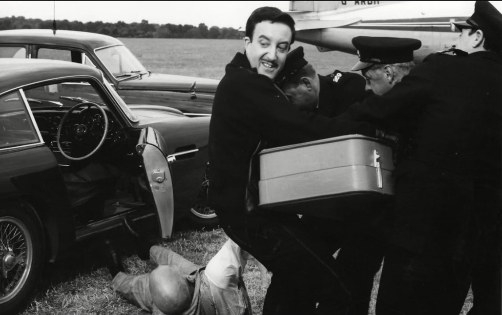 Sellers wrestles with Scotland Yard's finest - with his DB4 GT getaway car alongside - in The Wrong Arm of the Law. Photo / REX, Shutterstock