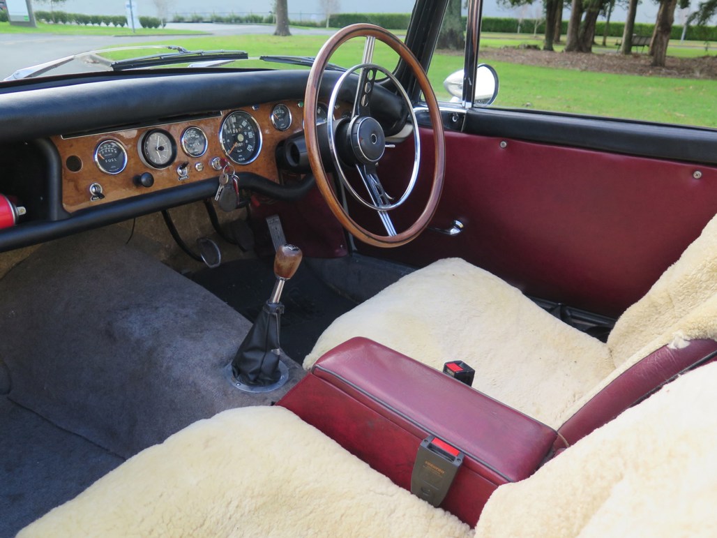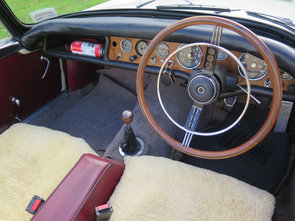The original wire wheels were swapped for Minilites. “The wire ones needed constant maintenance”, and it’s been reupholstered as per original. “The wooden dash gets a hard time in an open car so the wooden part is new,” with the original instruments refitted. Replacement bits are often obtainable from the US or UK.