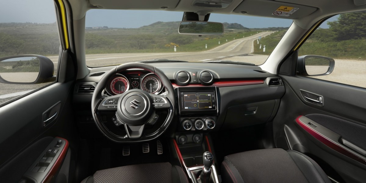 The Swift Sport has the pronounced front seat bolsters, highlight stitching accents, metal pedals and leather-trimmed D-shaped sports steering wheel to meet hot-hatch expectations.