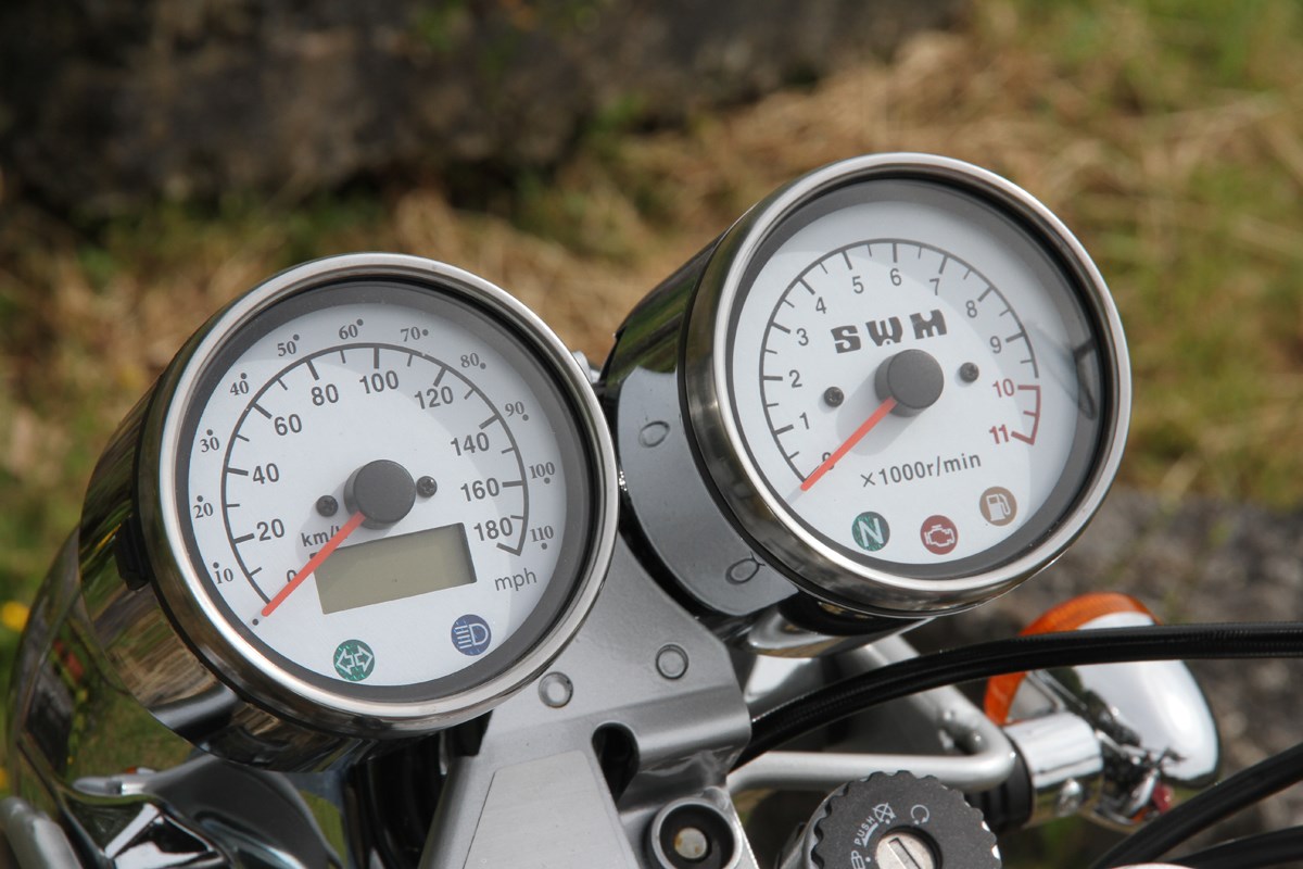 Up front is a 19-inch spoked wheel, wrapped in a 100/90 section road-biased knobbly tyre. Despite its semi off-road rubber, the Silver Vase is an easy bike to live with on the open road. If I were to recommend one of the two 440 SWMs to a learner it would have to be the Scrambler as it is just so straightforward to ride.