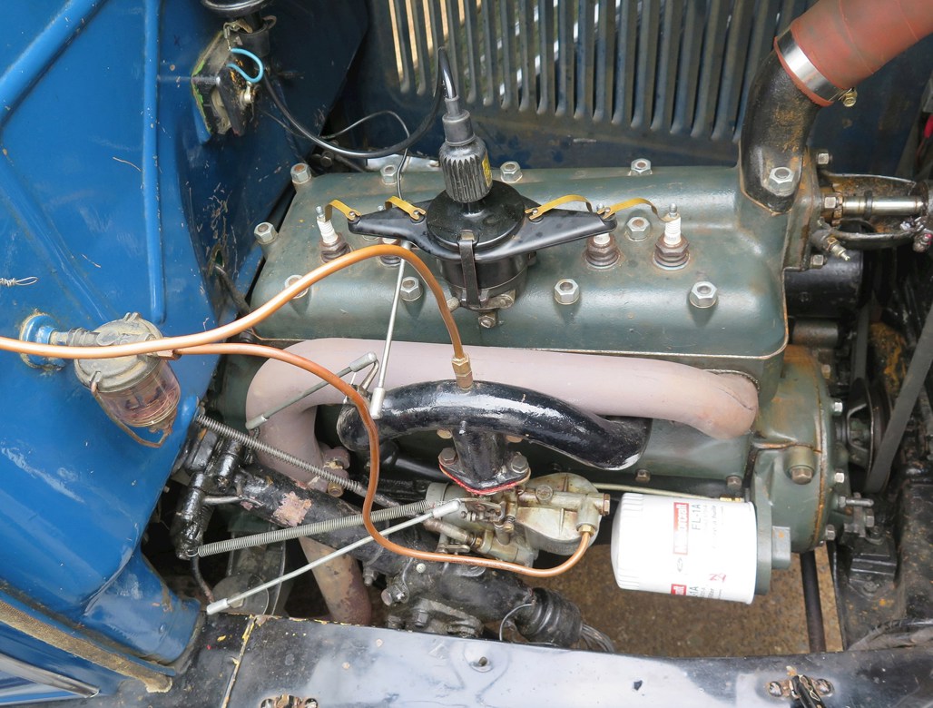 The car was reupholstered in the 1960s, and again a few years ago, but the roof is the 1960s version, restitched when that went rotten. There is a modern oil filter and an air filter. “For dusty roads, as otherwise you’re just cutting and polishing the bore.”