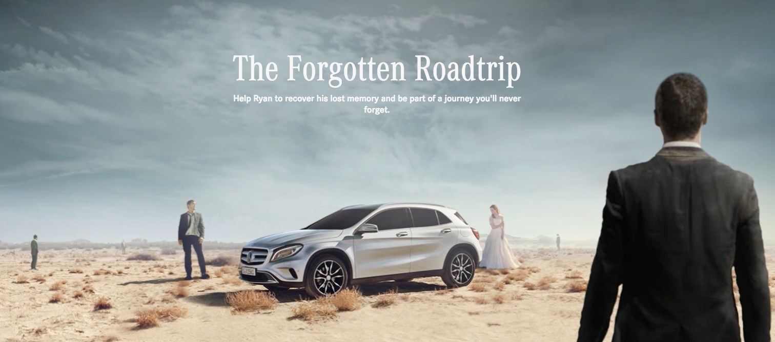 The road trip is an interactive story involving an impossibly handsome hero who wakes up in the desert with no memory and only a Mercedes GLA, and you must help him unravel the mystery that led him there.