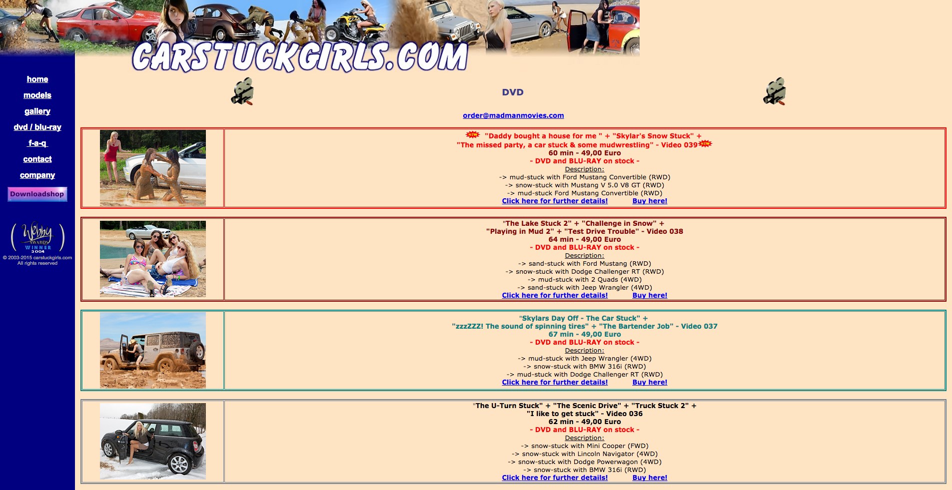 Weird and slightly creepy, the central theme behind CARSTUCKGIRLS.COM is in its title - it sells videos and photos of scantily clad women getting their cars stuck and then trying to get them out again.