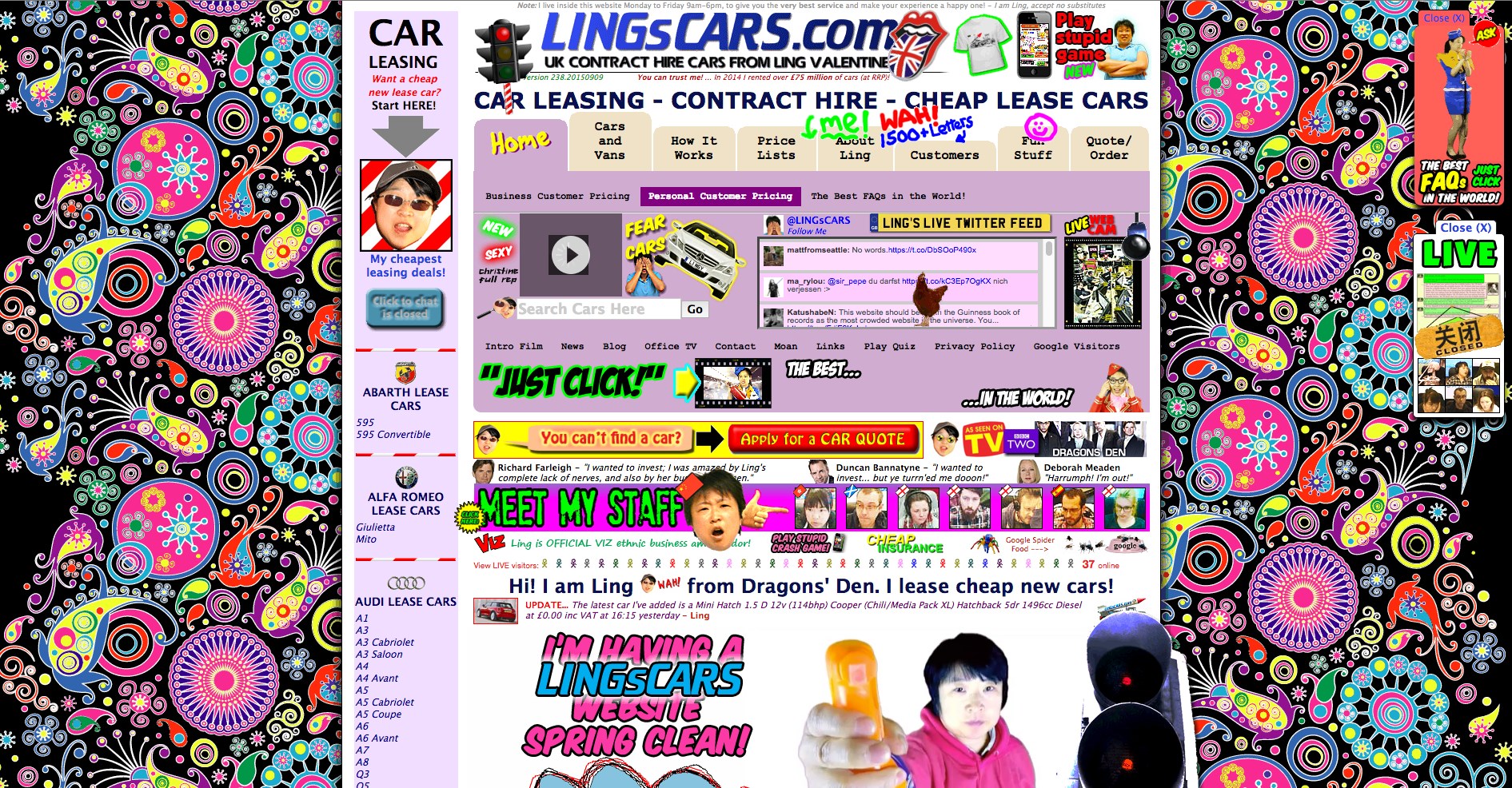The bizarre seizure-inducing explosion of colour, animated gifs and startling self-promotion is actually a website for a remarkably successful car leasing business run by the website’s star Ling Valentine.