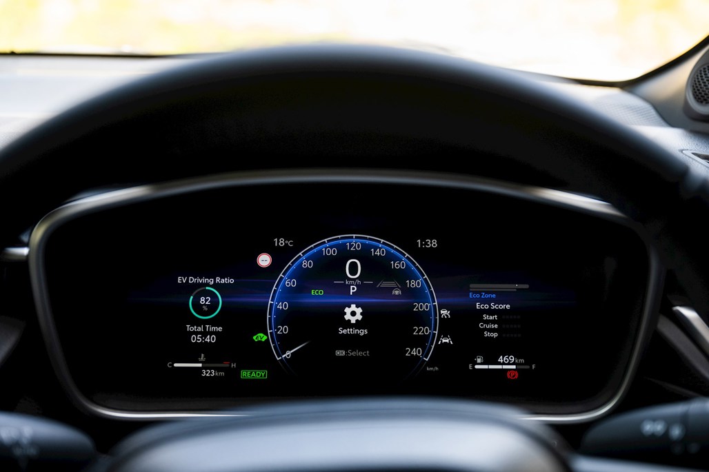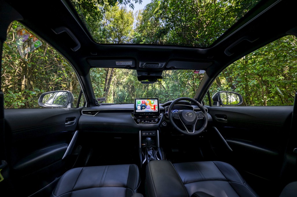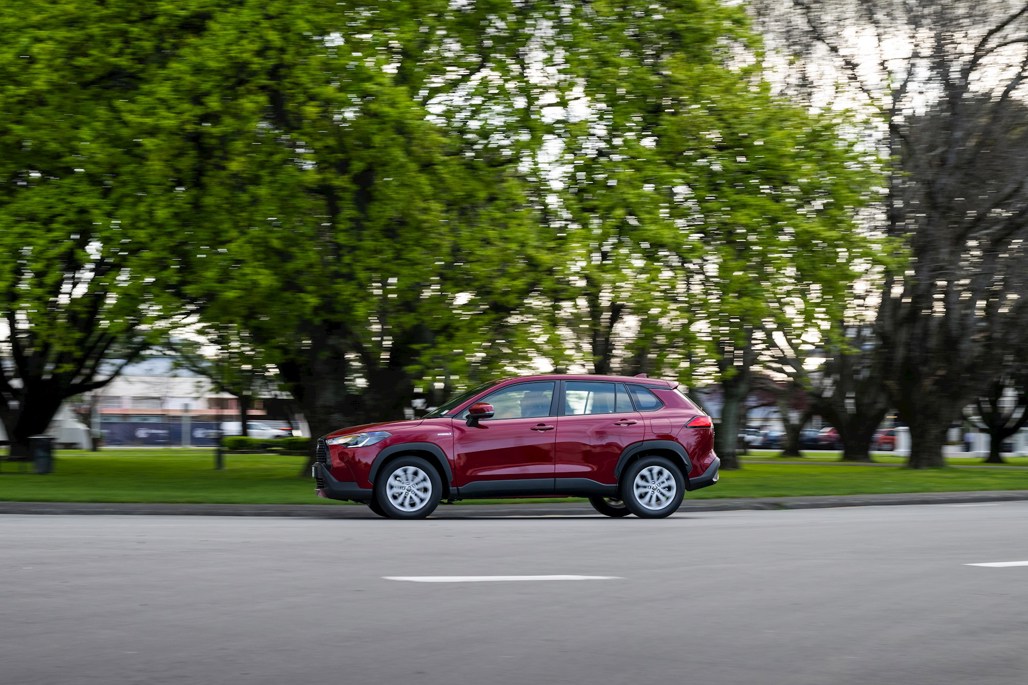 The chassis the same basic GA-C platform as the C-HR and Corolla, while mechanically, Corolla Cross uses the same 2.0-litre four-cylinder petrol engine and 30kW motor in the engine bay and battery under the rear seats, for a performance or economy boost; though the rear suspension on the AWD models is wishbone, versus torsion beam, to enable room for running gear. The AWD versions also get a larger fuel tank (46l versus 36l for FWD), and larger range as a result, 870km over 750km.