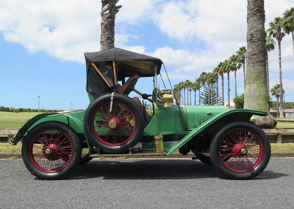 Since restoring it, he’s driven it to the North Cape, to Wellington, “From Wellington it used no oil, no water and no air in the tyres.” It’s a four-stroke, with a four-speed transmission, and no synchro so you double declutch (put the clutch in, change to neutral, let the clutch out, back in, and change gear) on every gear. “I don’t use the clutch sometimes, I don’t worry about it.” The wire wheels are fairly unusual for the time, he says. The brass canister on the driver side makes the acetylene for the headlight, the other lamps use kerosene. There’s a lot of brass on this car, “It takes me about five hours or more polishing; when my daughter’s here we take a side each.”